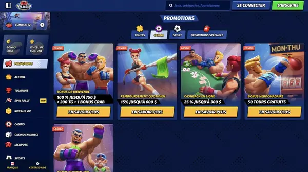 Les joueurs sports peuvent utiliser un Bonus de recharge hebdomadaire de 50% jusqu’à 750 $CA sur le premier dépôt de la semaine, ainsi qu’un Cashback Sports de 10% jusqu’à 750 $CA sur les pertes de paris. Nous indiquons les dates exactes, les étapes d’activation et les éventuelles exigences de mise dans chaque carte promo, afin que vous puissiez décider si un Bonus BigClash correspond à votre style de jeu.