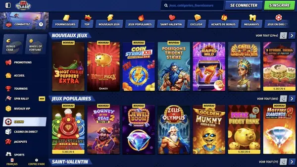 Dans Casino BigClash, vous pouvez explorer 14 000 jeux, dont des machines à sous, des jeux de table, des jackpots, un casino live, des cartes à gratter, des sports virtuels et un sportsbook complet. Nous travaillons avec de grands studios comme NetEnt, Play’n GO, Pragmatic Play, Evolution Gaming, Nolimit City, et bien d’autres, ce qui vous permet de retrouver des titres connus comme des nouveautés. Si vous recherchez une configuration adaptée au Canada, Casino BigClash Canada prend en charge le CAD et propose Interac, ainsi que plusieurs options de portefeuilles électroniques et de cryptomonnaies.